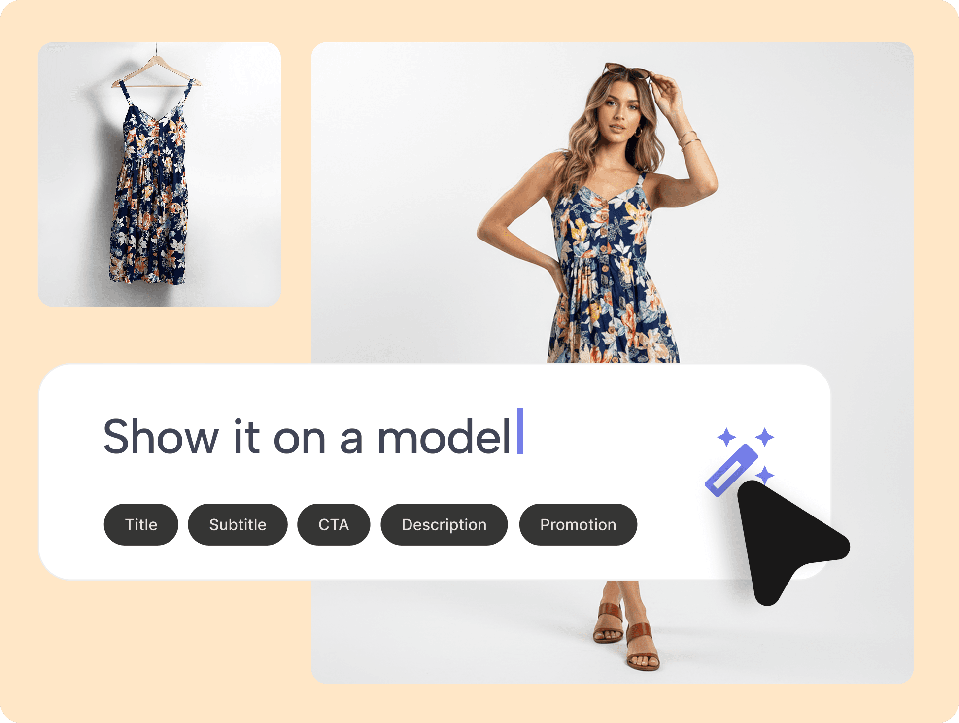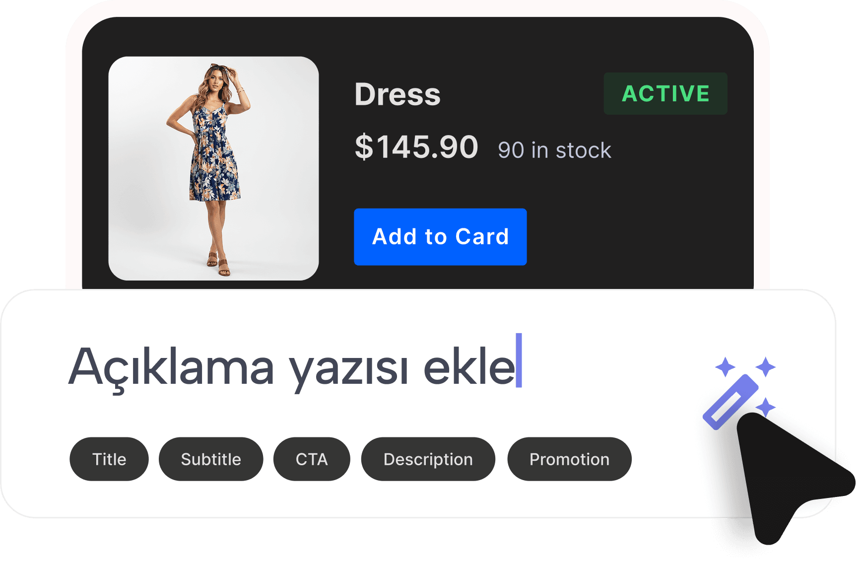 Arka plan kaldırma, ürün fotoğrafçılığı, sanal model, stüdyo çekimi, ürün açıklamaları, çeviri ve daha fazlası — hepsi tek tıkla, hepsi kataloğunuzun içinde.