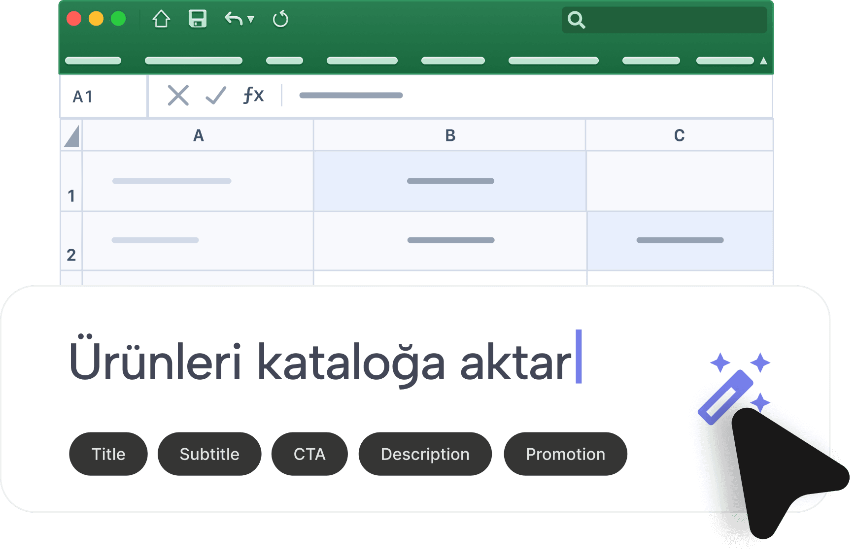 Arka plan kaldırma, ürün fotoğrafçılığı, sanal model, stüdyo çekimi, ürün açıklamaları, çeviri ve daha fazlası — hepsi tek tıkla, hepsi kataloğunuzun içinde.